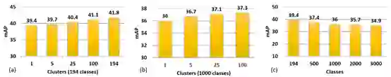图3:显示了当改变了簇的数量(超类)时,ImageNet检测集中194个类的mAP。这里显示了194个类和1000个类检测器。作者也绘制了针对不同类数量的基于物体检测器的mAP。