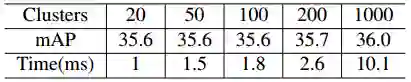 表3:对于1000个类别检测器在不同数量的簇下的mAP分数和每幅图运行时间(毫秒)。