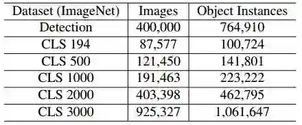 表1:ImageNet中图像的数量和对象实例的数量和以及ImageNet分类(CLS)训练集的不同版本。