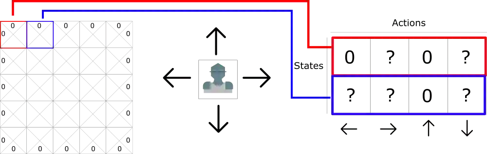 在我们探索环境(environment)之前,Q-table 会给出相同的任意的设定值(大多数情况下是 0)。随着对环境的持续探索,这个 Q-table 会通过迭代地使用 Bellman 方程(动态规划方程)更新 Q(s,a) 来给出越来越好的近似。