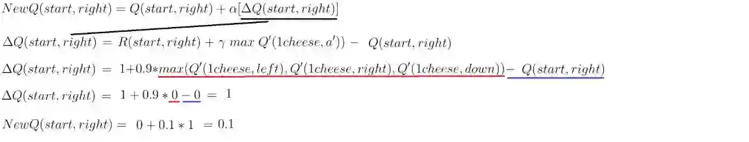 接着我们将初始的 Q 值与 ΔQ(start, right) 和学习率的积相加。