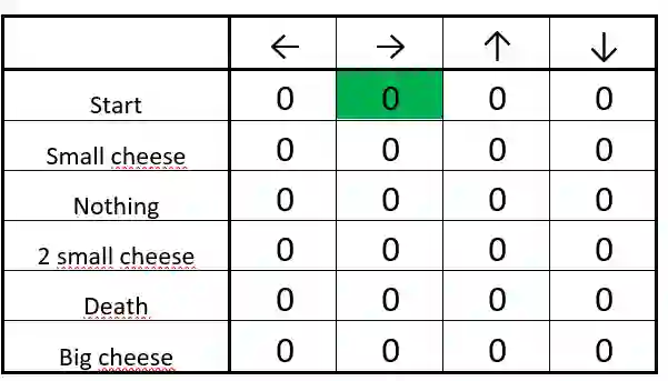 将这个 Q-table 想象成一个「备忘纸条」游戏。得益于此,我们通过寻找每一行中最高的分数,可以知道对于每一个状态(Q-table 中的每一行)来说,可采取的最佳动作是什么。