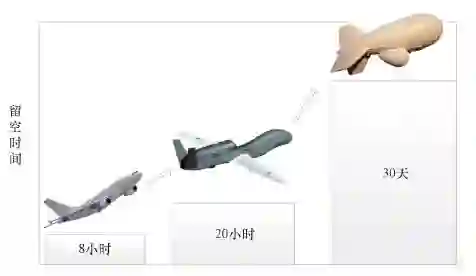 系留气球的能源可以通过与系缆集成在一起的电缆光缆从地面供给,无需气球上携带,与其他飞行器相比大大延长了滞空时间。图5即为系留气球与固定翼飞机的留空时间对比。系留气球可滞空一个月,远远高于载人飞机和无人机不足一天的飞行时间。即使与其他中低空浮空器(lighterthan-air,LTA)相比,在滞空时间上也具有明显的优势。而其一次性滞空多日也实现了持续监控的目的。