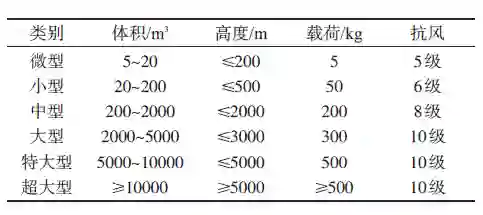 军事上应用的系留气球系统一般都部署在野外,无球库之类的遮蔽设施,所以抗风能力是一项重要指标。不同的气球因体积、构型、环境适应性等要求的不同,其抗风能力大相径庭。小型的系留气球系统锚泊设施相对简单,系缆及球载系统追求轻便,抗风能力较弱,但其部署方便,可以根据天气预报情况快速撤收,避免大风对其造成损坏。中大型系留气球系统的锚泊设施、系缆、连接件结构等强度较高,具备整体较高的抗风能力。根据体积大小,系留气球分类及其性能如表1所示。