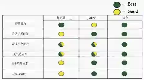 图14在部署能力、定点续航时间、战场生存能力、天气依赖性、生命周期成本、系统负担能力等方面将JLENS系统与固定翼飞行器进行对比,如果能与固定翼飞行器联合组网将达到最佳效果。