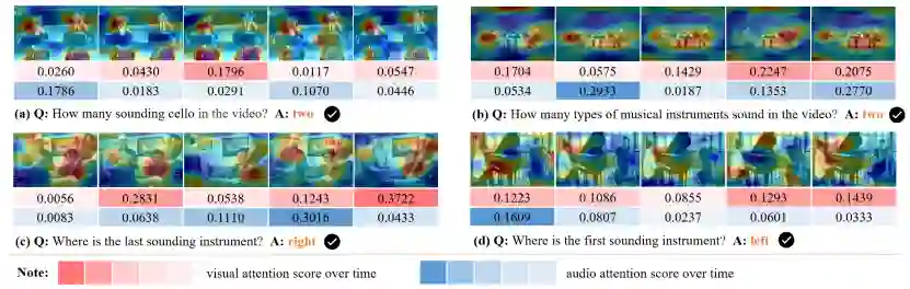 如下图所示的单簧管双重奏场景,当回答 “哪个单簧管先发声?” 的问题时,需要在视听场景中先定位出发声的单簧管,并在时序维度上重点聚焦于哪个单簧管先发出声音。要正确回答这个问题,本质上需要有效地对视听场景理解和时空推理。