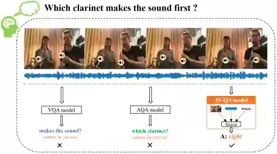 对于上面这个例子,若我们仅考虑基于视觉模态的 VQA 模型则很难对问题中涉及的声音信息进行处理,相反,若我们只考虑基于声音模态的 AQA 模型,同样难以对问题中涉及的空间位置信息进行处理。但是,我们可以看到同时使用听觉和视觉信息可以很容易的对场景进行理解并正确的回答上述问题。
