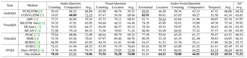 近年来,研究人员在声音对象感知、音频场景分析、视听场景解析和内容描述等方面取得了显著进展。尽管这些方法能将视觉对象与声音关联,但它们中的大多数在复杂视听场景下的跨模态推理能力仍然有限。相比之下,人类可以充分利用多模态场景中的上下文内容和时间信息来解决复杂的场景推理任务,如视听问答任务等。现有的视觉问答(VQA)和声音问答(AQA)方法等往往只关注单一模态,从而不能很好的在真实的视音场景中进行复杂的推理任务。