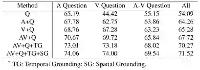 如表 2 所示,引入 Audio 和 Visual 模态信息都有助于模型性能的提升。此外,能明显看到当结合声音和视觉模态时,AV+Q 模型的性能比 A+Q 和 V+Q 模型要好得多,这表明多感官感知有助于提升问答任务的性能。我们也能看到视音空间关联模块和时序关联模块都能够很明显的提升模型的性能,从而更好地对场景进行理解。