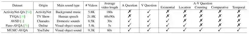 如表 1 所示,该研究发布的 MUSIC-AVQA 数据集具有以下优势:1)MUSIC-AVQA 数据集涵盖大量的声音问题、视觉问题和视听问题的问答对,比其他问答类数据集更全面丰富。对于大多数问答任务数据集(ActivityNet-QA, TVQA 等)来说,仅包含了视觉问题,难以探索视听相关的研究。虽然现有的 AVQA 数据集(AVSD, Pano-AVQA 等)也提供了视听问答对,但它们更专注于相对简单的问题(Existential 或 Location),只需要空间推理即可做出回答。2)MUSIC-AVQA 数据集由包含丰富视听成分的乐器演奏场景组成,有助于更好地研究视听交互场景理解和推理,并可以在一定程度上避免场景中的噪声问题。大多数公开问答类数据集(ActivityNet-QA, AVSD 等)中的声音信息通常与其视觉对象不匹配,会产生严重的噪声(如背景音乐),这使得它们难以探索不同模态之间的关联。此外,TVQA 数据集虽然包含视觉和声音模态,但其声音是由人类说话声组成的,在其问答对构建过程中也只使用了相应的字幕信息,并不是真正的视音关联场景。