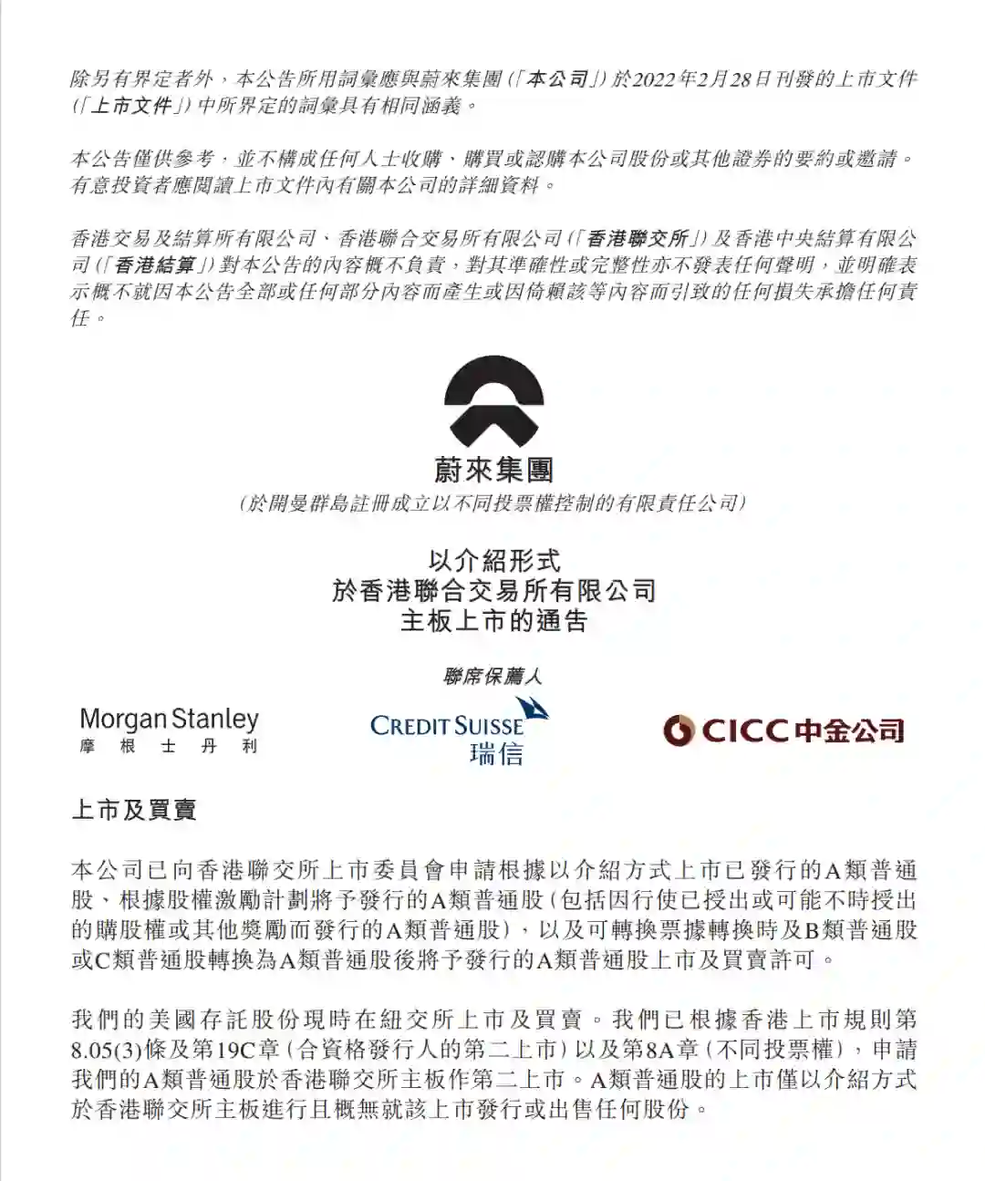 港交所文件今日披露,蔚来集团申请在香港联交所主板上市。联席保荐人为摩根士丹利、瑞信和中金公司。A类普通股预期将于2022年3月10日(星期四)开始在香港联交所买卖。