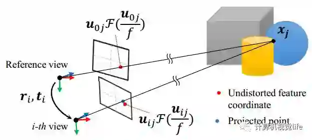 2、先假设初始的相机内参和畸变参数,利用光束平差法最小化重投影误差,迭代得到相机的内外参数、特征点对应的三维空间点。其原理示意图如下所示。Uij是第i张图像相对于图像中心的第j个特征点的畸变坐标,红色点是其去畸变后的坐标。蓝色点是重投影的坐标。目标就是最小化第i帧中红色点和蓝色点的位置误差。