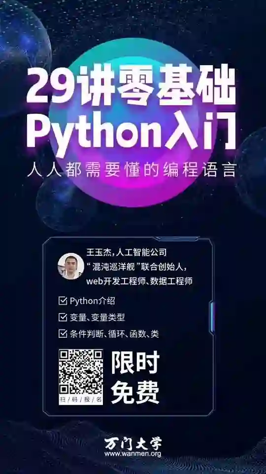 文末福利来了~万门大学推出了《29讲零基础Python入门》,扫码报名,限时免费~