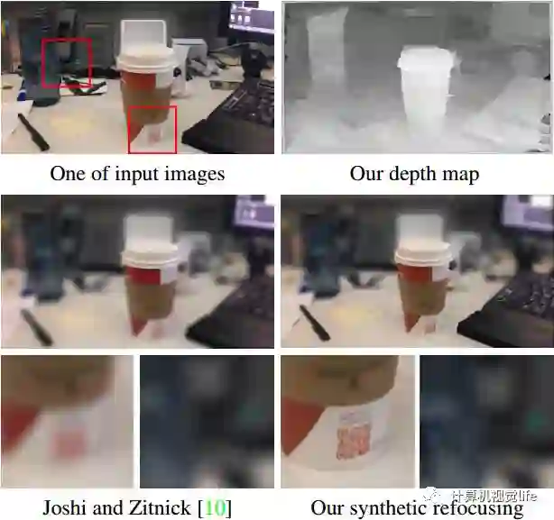 该算法和其他算法在重对焦效果上的对比如下图所示。可以看到该算法能够在背景虚化的同时保持相对锐利的边缘。