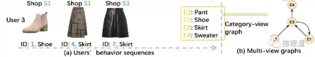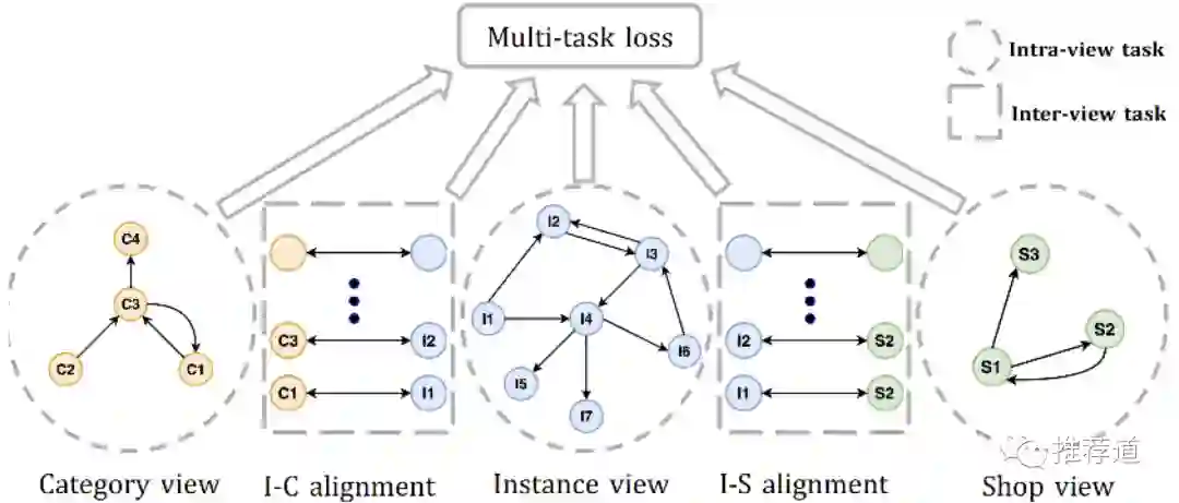 文中的场景被称为multi-view,即item/shop/category是三个view。换一套语境,同样的场景可以被称为异构图(item/shop/category是三类异构节点)或知识图谱(item/shop/category是三类entity)。拿“异构图”或“知识图谱”来搜索,其实业内有很多工作聚焦于"多域信息融合"的问题。