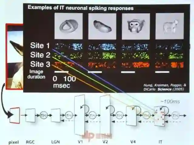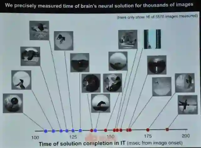 根据教授的测试,从把图像呈现给眼睛,到 IT 产生响应,其中的延迟大约100毫秒。他们测量响应的方法是在猴子大脑的不同区域植入多通道电极,测量到了神经脉冲的电极就显示为了图中测试结果中的一个亮点,很多个亮点就组成了雪花一样的测量结果。通过四张图像、IT 中三个不同区域的测量结果,可以明显看出 IT的这个约100毫秒的响应延迟。它同时也体现出,IT 中的不同区域的对同一个类别图像的响应是不一样的。