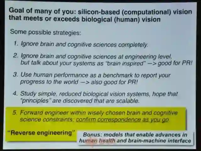 最理想的状态是上面的 PPT 中黄色的这种,CV界的人把自己的研究看作是尝试构建系统的前向工程,不过要符合一些大脑本身和认知科学的限制。神经科学界的人就是反过来,把大脑看作已经构建好的系统,研究大脑的限制和原理、尝试模仿大脑结构的反向工程,在过程中逐步对所用的机理和例子做验证。这样,神经科学和神经网络的研究可以看作是互为表里,这样的研究成果也会给脑机互动带来更多的可能性。