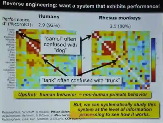 根据误识别模式矩阵,人类表现和非人的灵长类动物表现基本相同,不仅体现在总体准确率上,也体现在会把哪些东西之间认混上。这样就可以在动物身上做神经级别的测试和操控,获得数据的类别和数量都可以大幅度提高。在此基础之上就可以对信息处理的机制进行系统性的研究。