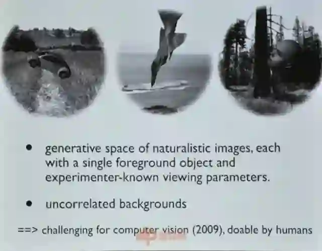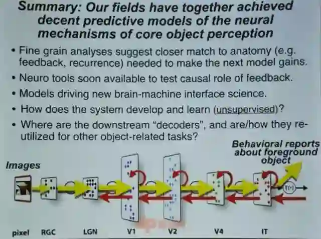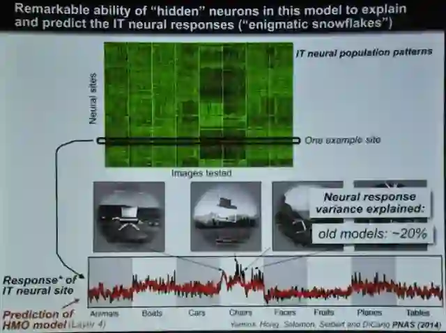 在当时的所有研究成果中,V1 阶层左右的神经细胞功能已经有了很好的解释和模型,虽然都是只考虑了前馈的模型,但用来解释 V1的响应的时候已经可以有超过50%的符合程度;但是各种计算模型对 IT 中响应的近似都不好,最多只有20%。所以那时候的模型表现都很差。
