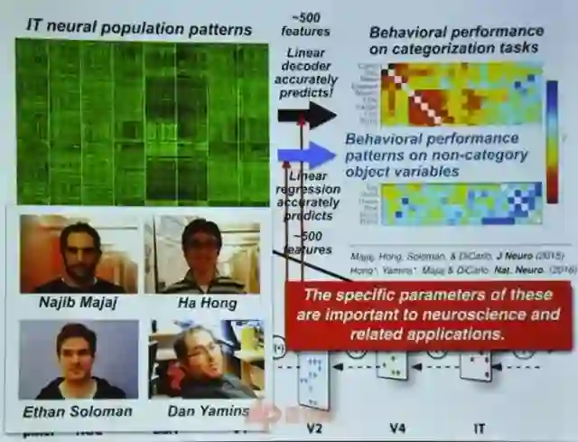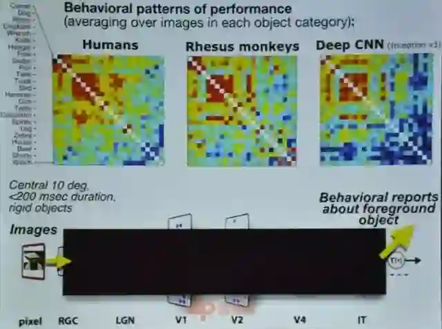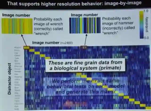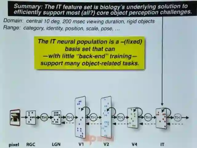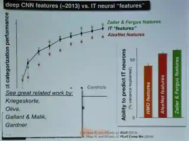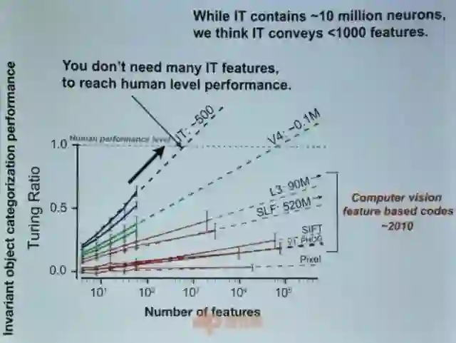 教授有一个有意思的发现:不需要测量太多的 IT 神经细胞特征就可以达到人类的表现,大约500个左右就够。同时代的计算机视觉模型中每个特征对模型表现的贡献就要小很多,很多的特征才能达到近似人类的表现。这说明了动物的视觉理解能力可能就是由一个维数不算高的特征集支撑的,计算模型就可以用这样的思路进行模仿。IT 大概含有一千万个输出神经细胞,但是传递的特征维数也就不到1000个。
