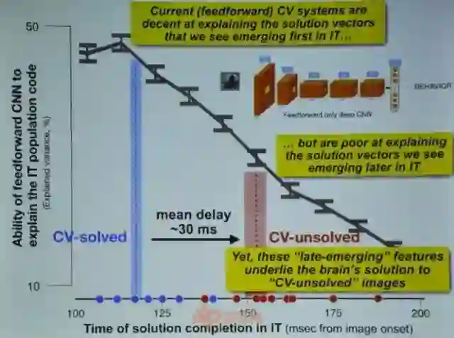 然后他们发现,对于那些计算机视觉表现未达到人类水平的图像(红点),IT中的响应时间多了一个明显的、平均大约30ms的延迟(相比达到人类水平的图像,蓝点)。他们认为这30ms内就是那些人脑有、但是CNN网络没有的结构在工作,比如多次反馈。