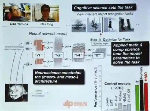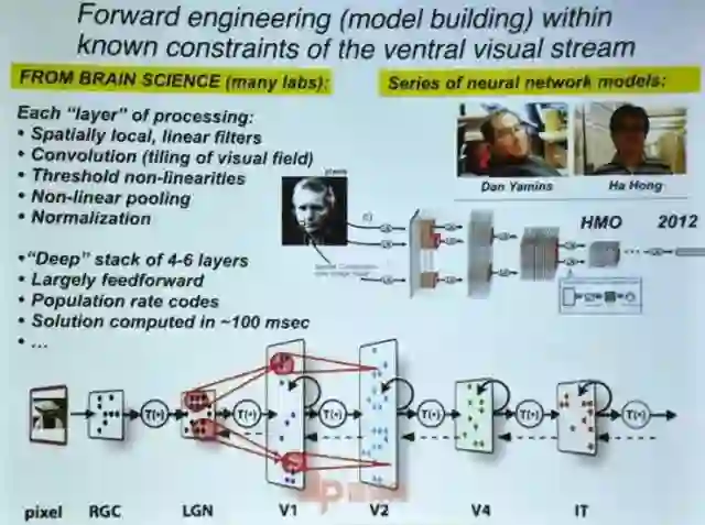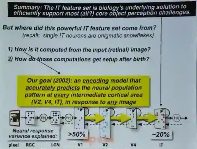 在了解了 IT 细胞的特性以后,更实际和更深入的问题也就来了:只有500个就够的 IT 神经细胞特征是如何形成的?它们是如何从视网膜信号的基础上逐步抽象的?在人类成长的过程中这些计算方法又来自哪里?如果能够研究清楚这些问题,也就对教授团队的目标有很大帮助。他们的目标就是想办法构建一个编码器模型,可以对任何一张图片、任何一个中间皮脂层都准确预测对应神经群的响应模式,刚刚的问题就是系统构成的关键问题。