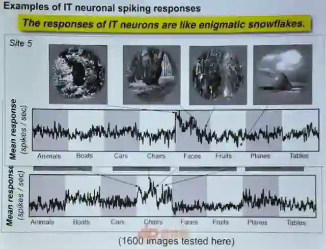 经过大量图像的测试,教授发现 IT 对不同类别图像的总体响应强度高低有所不同(其它神经科学家有也有研究具体某个位置的神经响应是如何变化的)。对于响应模式来说,每个IT细胞都有所不同,每次的响应也不完全相同;上一张PPT里把神经响应画成了雪花的话,那么从来就不会出现一模一样的雪花。