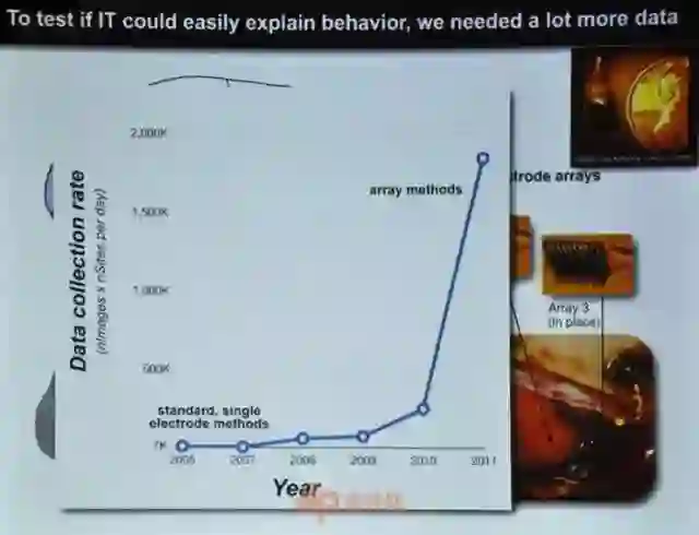 在这里,教授再一次提到了在动物大脑内手术植入电极。通过不同区域多个电极、每个电极可以采集96个通道(96针)的信号、做大量实验的方法,对IT等部位构建了维数非常高的数据空间。获得的数据量相比以前单电极的时代也有着爆炸性的提高。