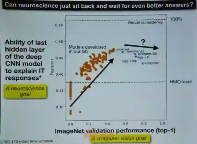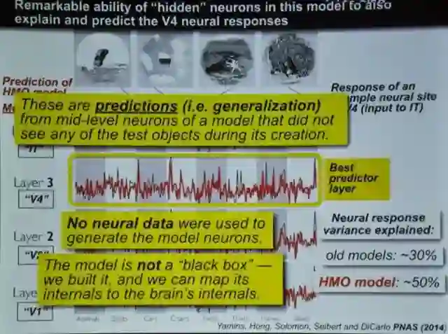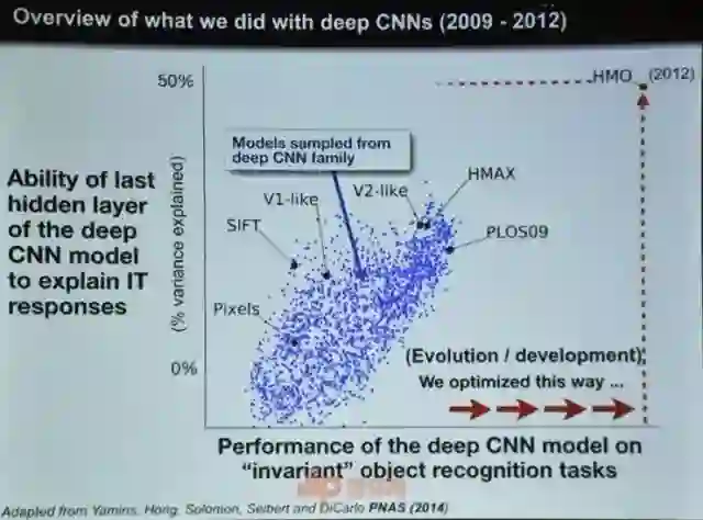 教授展示了这样一张图,在卷积神经网络研究的过程中,网络本身的物体识别能力是重要的性能指标,而实际上识别能力越强的模型也对 IT 响应的解释能力越好;HMO这样的模型在性能表现进化的同时,对IT表现的解释能力也达到了新高峰(2012年时)。