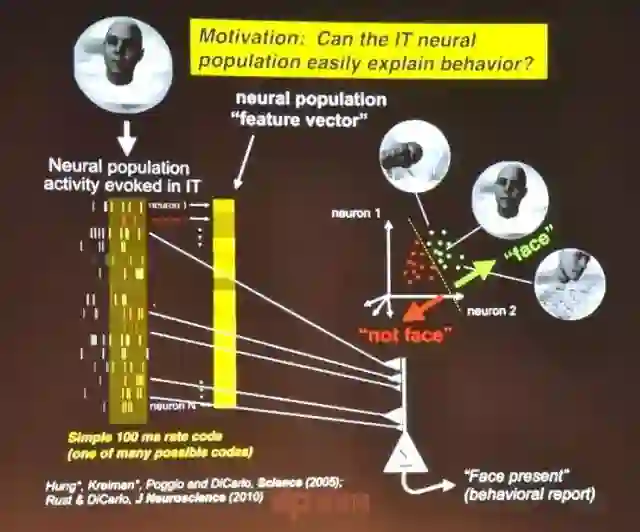 在有这些研究结果以后,教授的研究小组就开始被这一系列问题困扰:如何根据神经细胞的响应特点解释测试中出现的误识别行为?生物表现出的外在行为肯定是受到 IT 的神经响应模式影响的,那么如何找到这种关系?IT 区域的输出神经有一千万个,又如何从这一千万个神经细胞中读取信号?