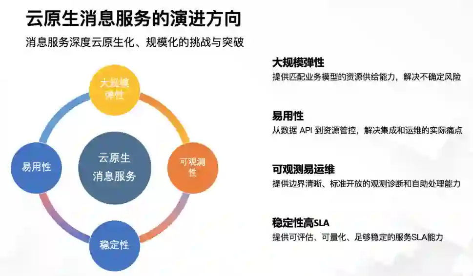 首先我们来看下云原生消息服务有哪些演进?面向未来,适应云原生架构的消息产品能力应该在以下方面做出重要突破: