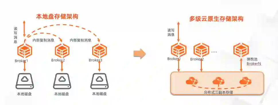 除了消息处理流量的弹性适应外,消息系统也是有状态的系统,存储了大量高价值的业务数据。当系统调用压力变化时,存储本身也需要具备弹性能力,一方面需要保障数据不丢失,另一方面还需要节省存储的成本,避免浪费。传统的基于本地磁盘的架构天然存在扩缩容问题,其一本地磁盘容量有限,当需要扩大容量时只能加节点,带来计算资源的浪费;其二本地磁盘无法动态缩容,只能基于业务侧流量的隔离下线才能缩减存储成本,操作非常复杂。