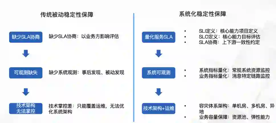 稳定性是生产系统必备的核心能力,消息系统往往集成在核心交易链路,消息系统是否稳定直接影响了业务是否完整和可用。但稳定性的保障本身并不只是运维管理,而是要从系统架构的设计阶段开始梳理,量化服务边界和服务指标,只有明确了服务的可用性和可靠性指标,使用方才能设计自己的故障兜底和冗余安全机制。