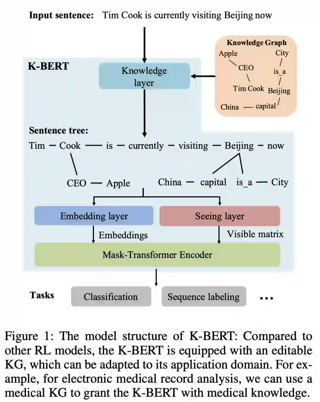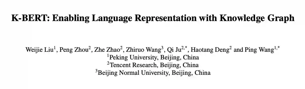 Weijie Liu等人的工作(北大、腾讯和北师大共同完成),提出了一个称为K-BERT的模型,它假设了每个句子(如果有可能)都会用知识图谱中的一个命名实体或关联对来标注。