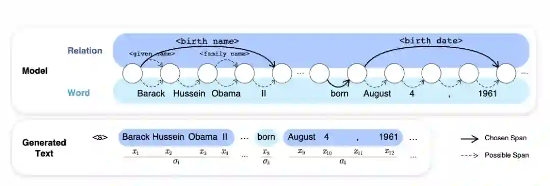 Hayashi等人在其工作中为自然语言生成任务(以知识图谱为条件)定义了一个隐关系语言模型(Latent Relation Language Models,LRLMs)。知识图谱对关系、实体和关系的表面形式(surface forms)/同义词等有益,且能够在生成token时被融入到概率分布中。也就是说,在每一步中,模型要么从词汇表中提取一个单词,要么使用已知的关系。