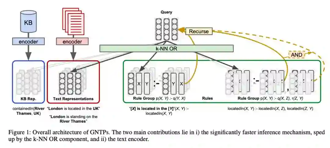 为了解决这一问题,论文作者推导出了一个贪心的邻近算法(kNN)策略来选择能够最大化证明分数的事实,从而GNTPs 更具可扩展性得多。同时,除了 (s,p,o) 三元组外,作者还可以用自然语言来表示规则,例如“伦敦坐落于英国”。