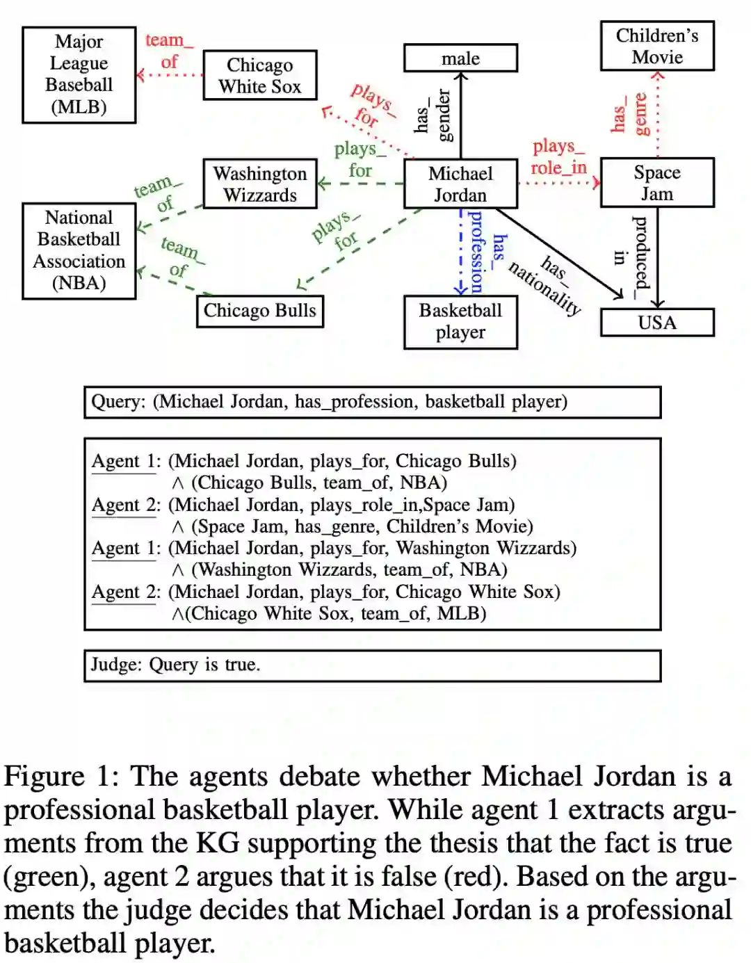 来自西门子中国研究院和慕尼黑大学的研究者 Marcel Hildebrandt等人从新的视角研究事实分类,让人眼前一亮。在论文中,他们提出采用R2D2算法中的辩论动态(Debate Dynamics )方法,其中两个Agent 通过证明或反驳给定的三元组进行“辩论”,同时最终由一个 Judge (作为一个二元分类器)决定三元组是真还是假。