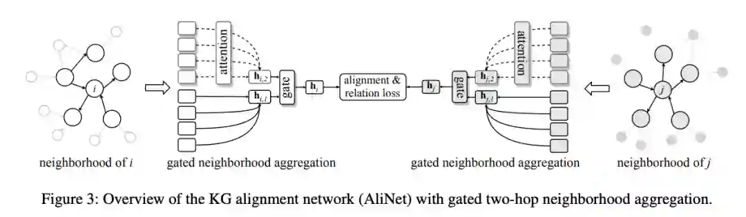 Sun等人提出了AliNet模型,这是一个端到端的基于GNN的框架,能够为实体对齐聚合远程多跳邻域。由于模式异质,这个任务变得更加复杂,因为不同知识图谱中相似实体的邻域不是同质的。