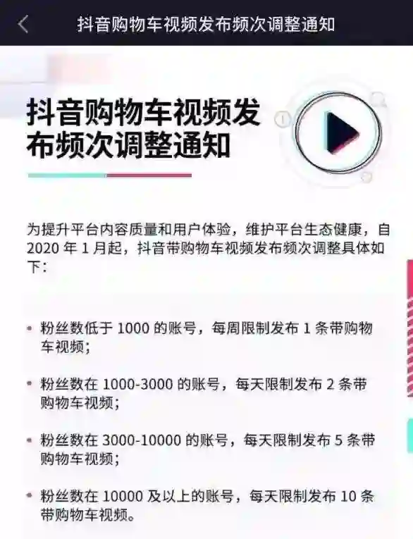 2020年1月9日,抖音宣布自2020年1月起,限制购物车视频发布频次,以粉丝量决定权限大小。抖音粉丝数最低级别的账号(粉丝量低于1000)每周只能发布1条带购物车视频,粉丝数最高一级的账号(粉丝数在10000以上)每天发布购物车视频上限是10条。