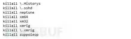 挖矿程序启动后会结束大部分挖矿软件的进程,并删除其他挖矿软件相关文件,独占资源。