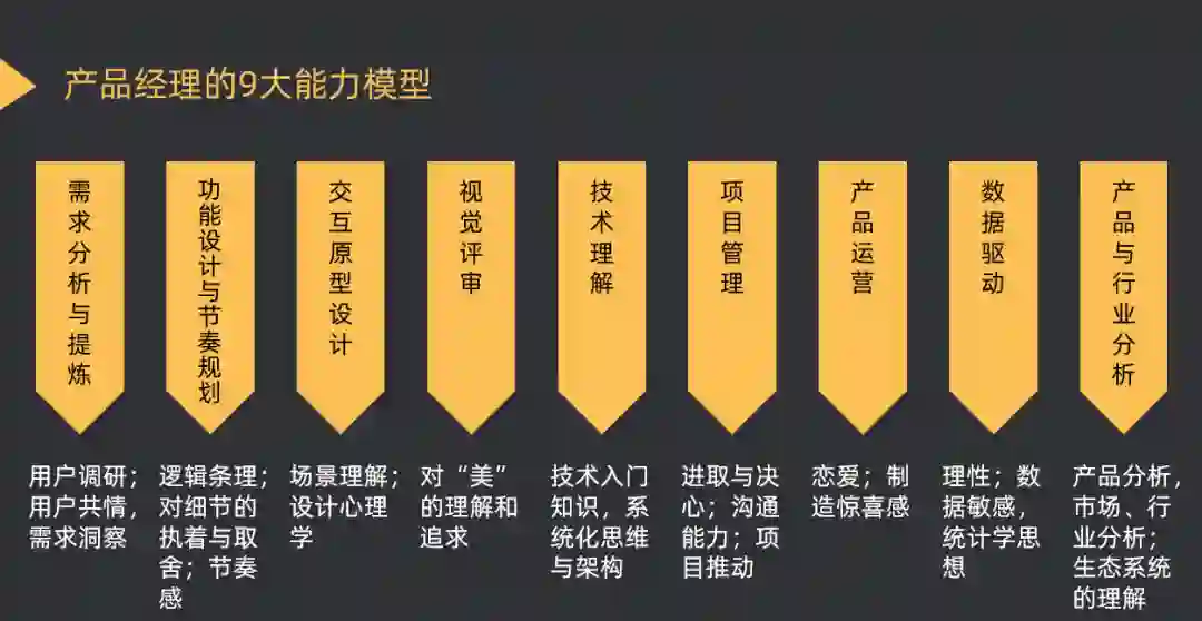 从产品经理真实的工作流程(参考下图)出发,拆解每个模块所需的能力要求,系统构建个人能力体系。
