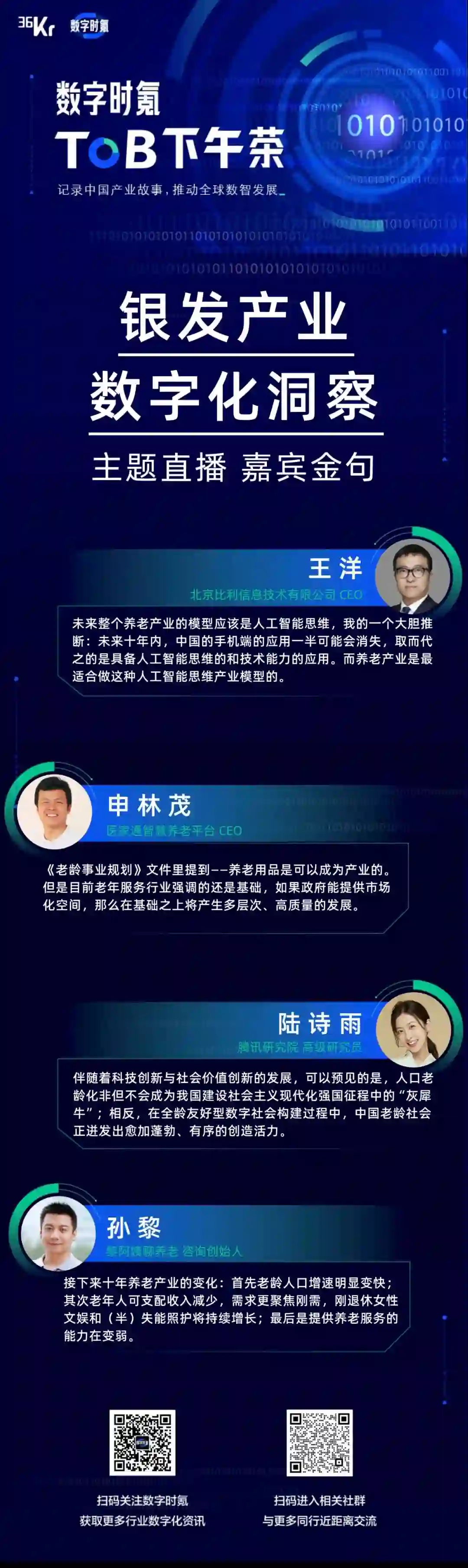 36氪数字时氪于2022年03月24日举办第五期「To B 下午茶」直播活动,我们将关注点放在了老龄化和银发产业,以「银发产业数字化洞察」为主题,探讨养老经济、银发产业、数智适老等话题,既有技术角度的解决方案,亦有人文温度的关怀思考,我们希望通过这次探讨,能够激发更多人对银发群体的关注,与国家战略齐步走,配合市场化手段提高产业服务质量,同时挖掘产业中蕴藏的更多机会,带领老人跨越数字鸿沟。