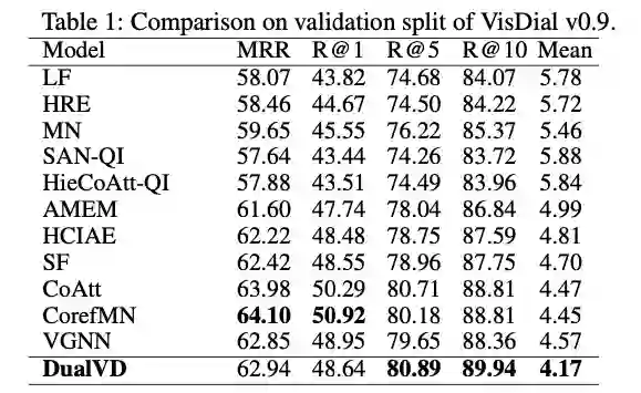 在 VisDial v0.9 和 VisDial v1.0 上对模型的效果进行了验证。与现有算法相比,DualVD 的结果超过现有大多数模型,略低于采用了多步推理和复杂 attention 机制的模型。