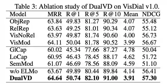 VisDial v1.0 验证集的消融研究利用了 DualVD 主要成分的影响。作者使用相同的 Discriminative decoder 做了充分的消融实验验证模型各个关键模块的作用, 如 ObjRep(目标特征)、RelRep(关系特征)、VisNoRel(视觉模块去掉关系嵌入表示) 、VisMod(完整视觉模块)、GlCap(全局语义)、LoCap(局部语义)、SemMod(语义模块)、w/o ElMo (不用预训练语言模型)、DualVD(完整模型)。
