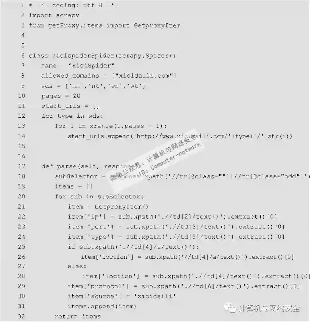 现在xiciSpider.py怎么编写已经一目了然了。xiciSpider.py的内容如下: