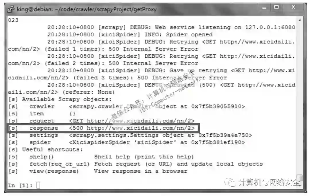 这里发现一个问题。respnose返回的代码是500,要知道返回码是200才是正常返回。在浏览器中打开http://www.xicidaili.com/nn/2是正常显示的,而该网页并不需要登录,那就是说并不涉及cookie。用scrapy shell请求页面和用浏览器请求页面用的是同一IP。也不存在IP封锁的问题。剩下的就只有headers中User-Agent的问题了。除去所有的不可能,最后那一选项大致就是正确答案。