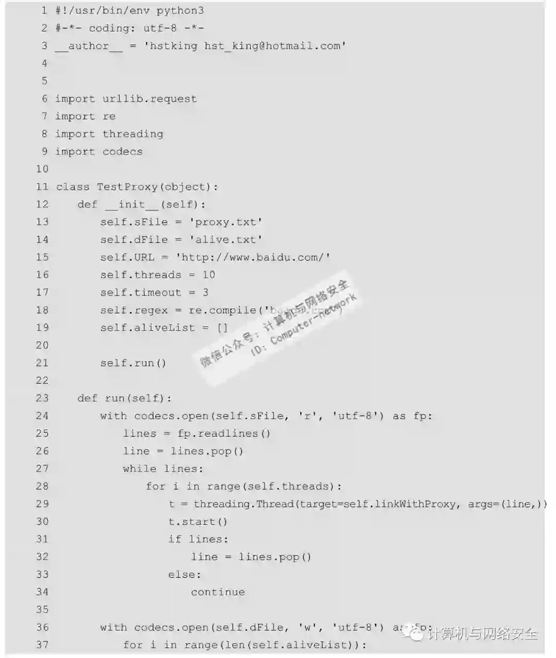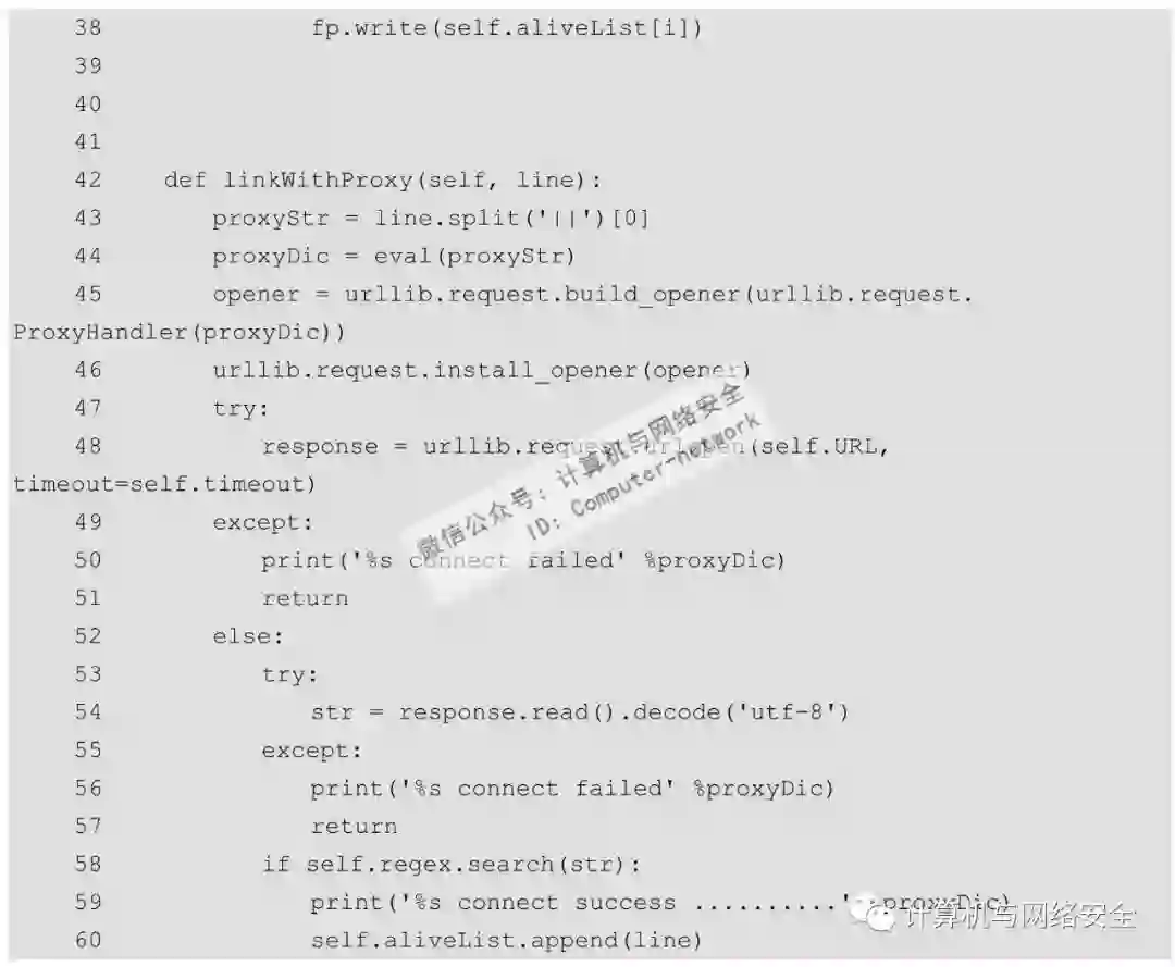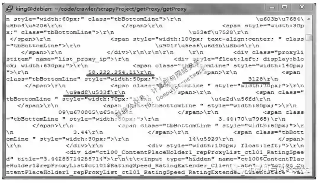 在14行中加入了两条竖线,是为了以后能方便地将代理字典({'http':'http://1.2.3.4:8080'})从字符串中分离出来。在15行中,写入文件时使用了strip()函数去除所得数据左右两边的空格。