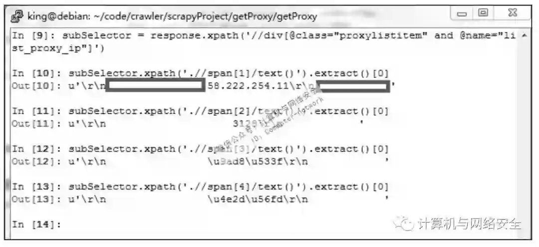 创建一个名为xiciSpider.py的Spider文件。items.py无须修改了,直接对xiciSpider.py做修改就可以了。我们还是先用scrapy shell命令来确定如何获取数据,执行命令: