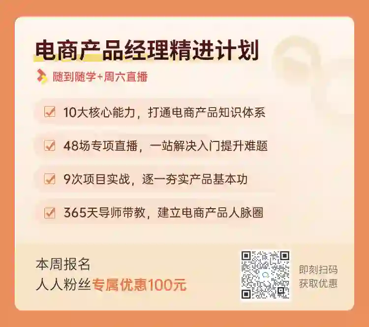 为此,起点课堂发起了《电商产品经理精进计划》,帮助0-3岁产品经理系统构建电商产品核心能力体系,告别野路子,快速入门,成为有思考、有策略的高薪电商产品经理!