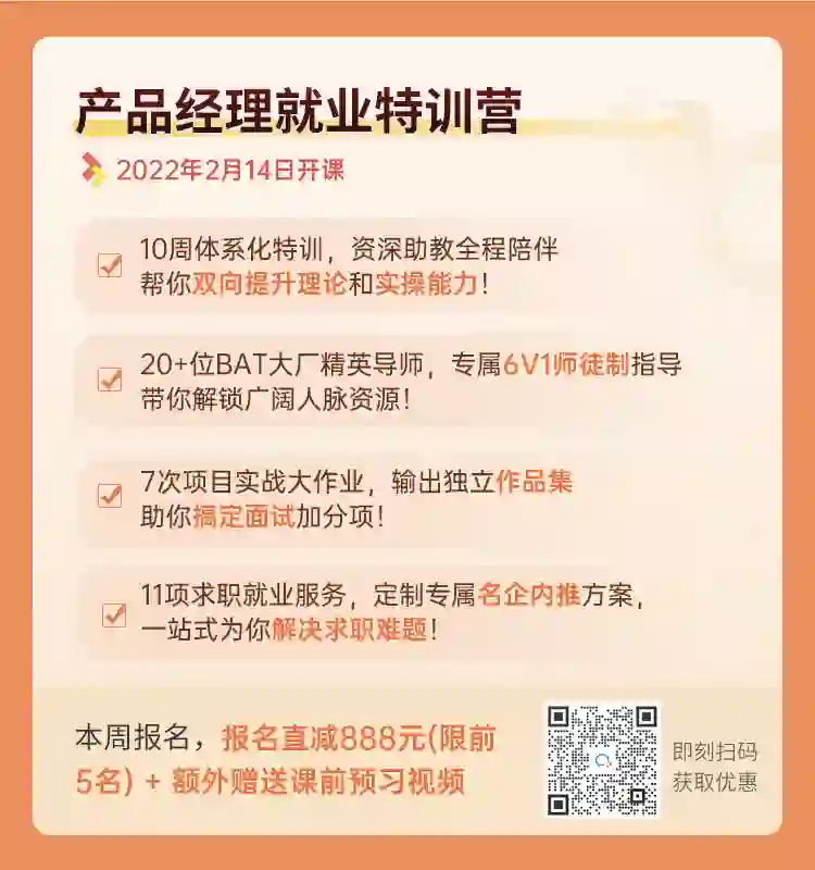 目前,特训营已帮助2000+小白/职场新人顺利入行就业产品经理,如果您也在入行/就业过程遇到难题,扫码免费获取一对一学习咨询服务,帮您做入行和学习规划!